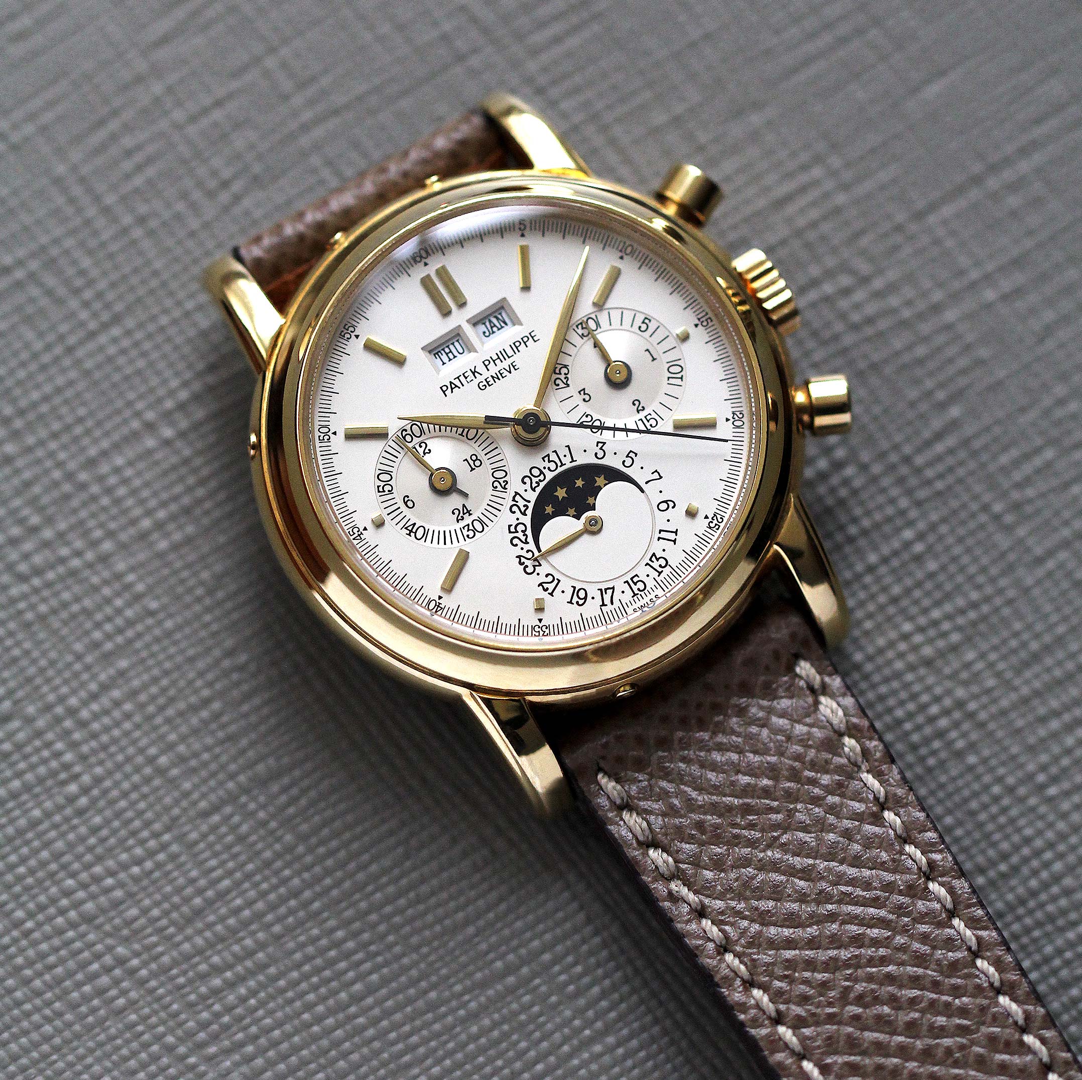 The opaline silvered dial features baton-shaped yellow gold indexes. The dual apertures found at 12 o’clock just above the ‘Patek Philippe Geneve’ are used for both the day and month. The sub-dial found at 3 o’clock is used for the 30-minute chronograph as well as the leap year indicator. At 9 o’clock the sub-dial is used for the 60-second counter and a day-night indicator. The day and moon phase indicators are found at 6 o’clock. The overall aesthetic of the 3970 oozes elegance and the lack of a tachymeter allows for an undisturbed view of the dial. The 36mm case wears well due to its elongated lugs as well as the heft of the watch. There are four external pushers found on the periphery of the case, these can be used to set the complication.