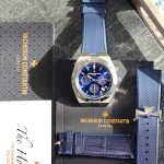 The vibrant blue lacquer dial is thought to be rather complicated to produce. The dial is signed Vacheron Constantin – Geneva at 12 o’clock. The recessed sub dials feature delicate guilloche and matt finished blue. Both sub-dials found at 3 and 6 o’clock are dedicated to the chronograph, whereas the other found at 9 o’clock is used for the ordinary 60 sweeping seconds. The hour a minute hands feature luminova.